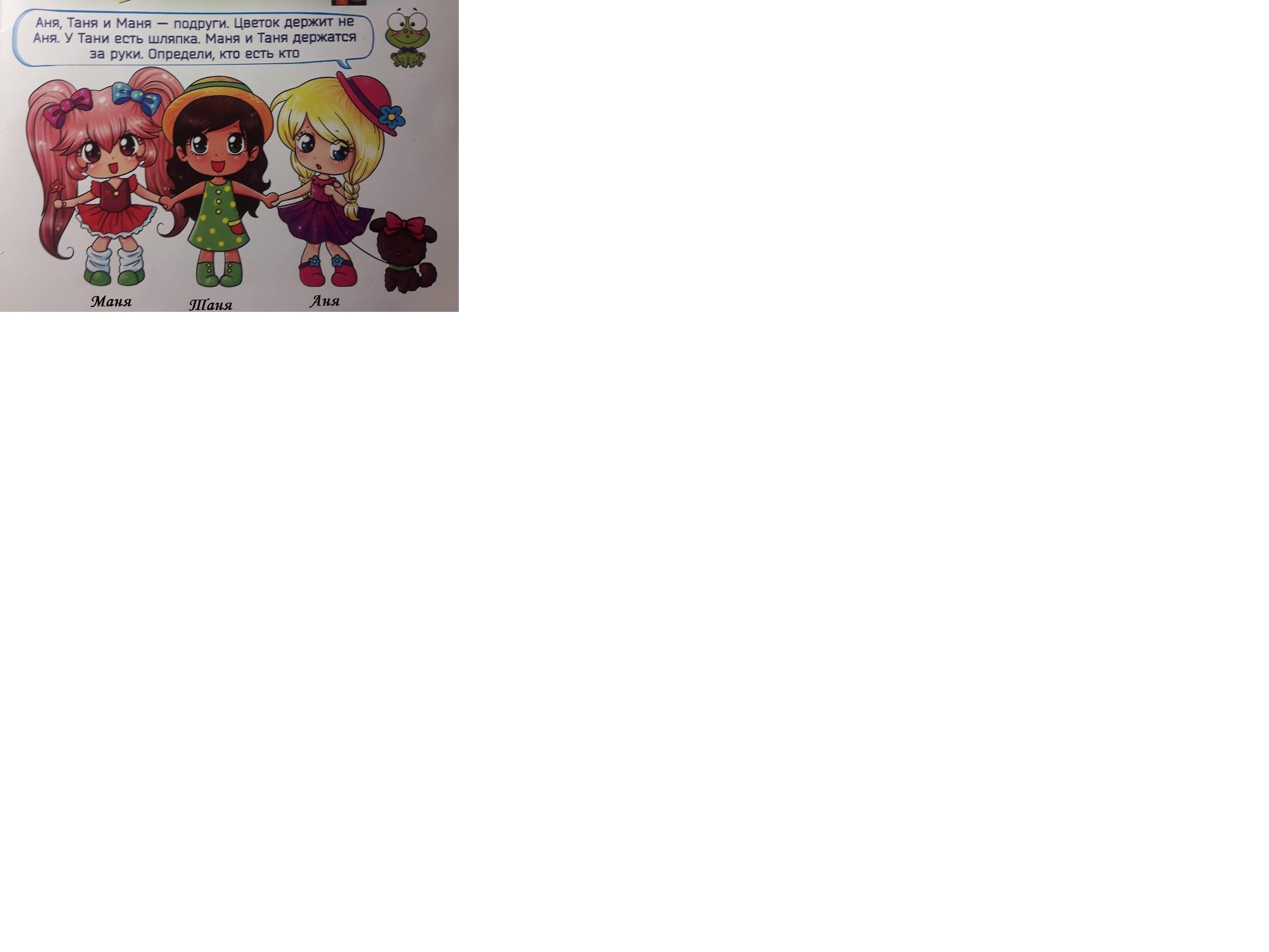 Ребята помогите мне это решить пожалуйста Аня, Таня и Маня - подруги. Цветок держит не Аня. У Тани есть шляпка. Маня и Таня держатся за руки Определи, кто есть кто
