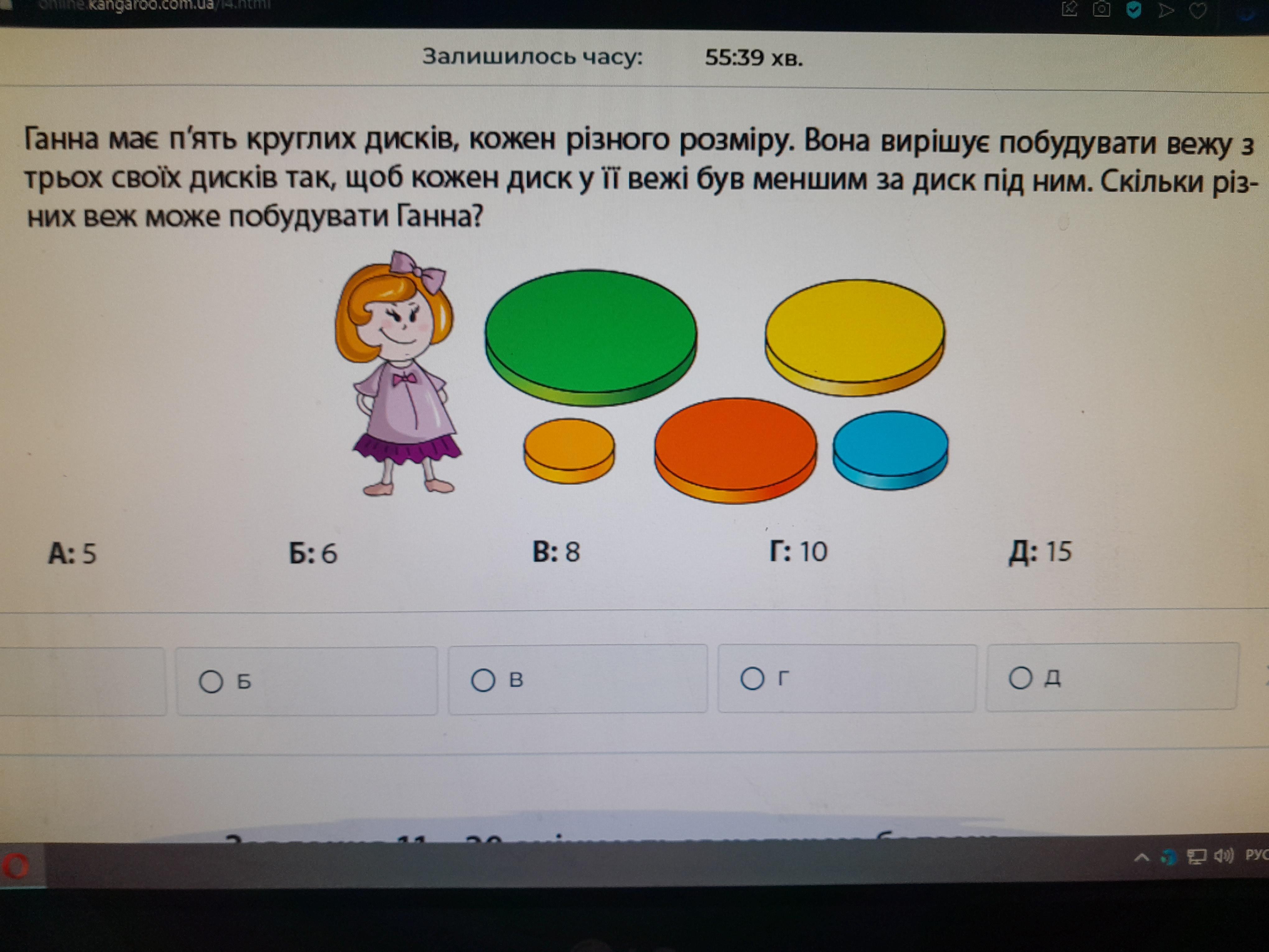 Ганна має п'ять круглих дисків, кожен різного розміру. Вона вирішує побудувати вежу з трьох своїх дисків так, щоб кожен диск у її вежі був меншим за диск під ним. Скільки різ- них веж може побудувати Ганна?
