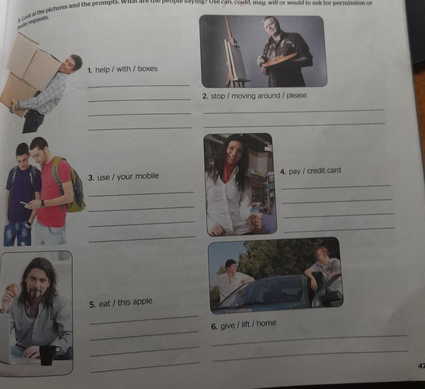 СРОЧНОB. Look at the pictures and the prompts. What are the people saying? Use can, could, may, will or would to ask for permission or make requests. 1. help / with / boxes 3. use / your mobile 5. eat / this apple 2. stop/moving around / please 6. give / lift /home 4. pay / credit card