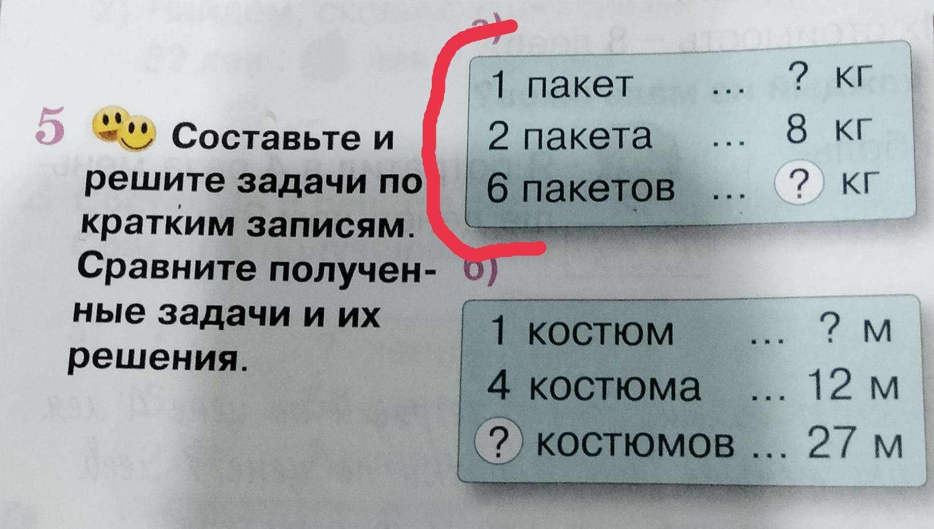 Ответ:1 В супермаркете 2 одинаковых пакета муки весят 8 кг. Сколько весит 1 пакет?Сколько весят 6 таких пакетов?