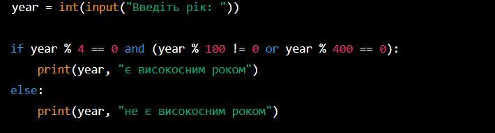Умовний оператор if перевіряє, чи є рік високосним. Якщо рік кратний 4 і не кратний 100 або кратний 400, то він високосний.
