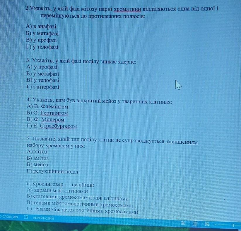 число слов: 789 2. Укажіть, у якій фазі мітозу парні хроматини відділяються одна від одної і перемішуються до протилежних полюсів: A) в анафазі Б) у метафазі B) у профазі Г) у телофазі 3. Ука, у якій фазі поділу зникає ядерце: А) у профазі Б) у метафазі В) у телофазі Г) i iнтерфазi 4. Укажіть, ким мейоз у тваринних клітинах: А) В. Флемінгом Б) О. Гертвінгом В) Ф. Мішером Г) Е. Страсбургером 5. Позначте, який тип поділу клітин не супроводжується зменшенням набору хромосом у них: А) мітоз Б) ам тоз В) мейоз Г) редукційний поділ 6. Кросинговер це обмін: А) ядрами між клітинами Б) статевими хромосомами між клітинами В) генами між гомологічними хромосомами Г) генами мiж негомологічними хромосомами n YYRMANEIDE