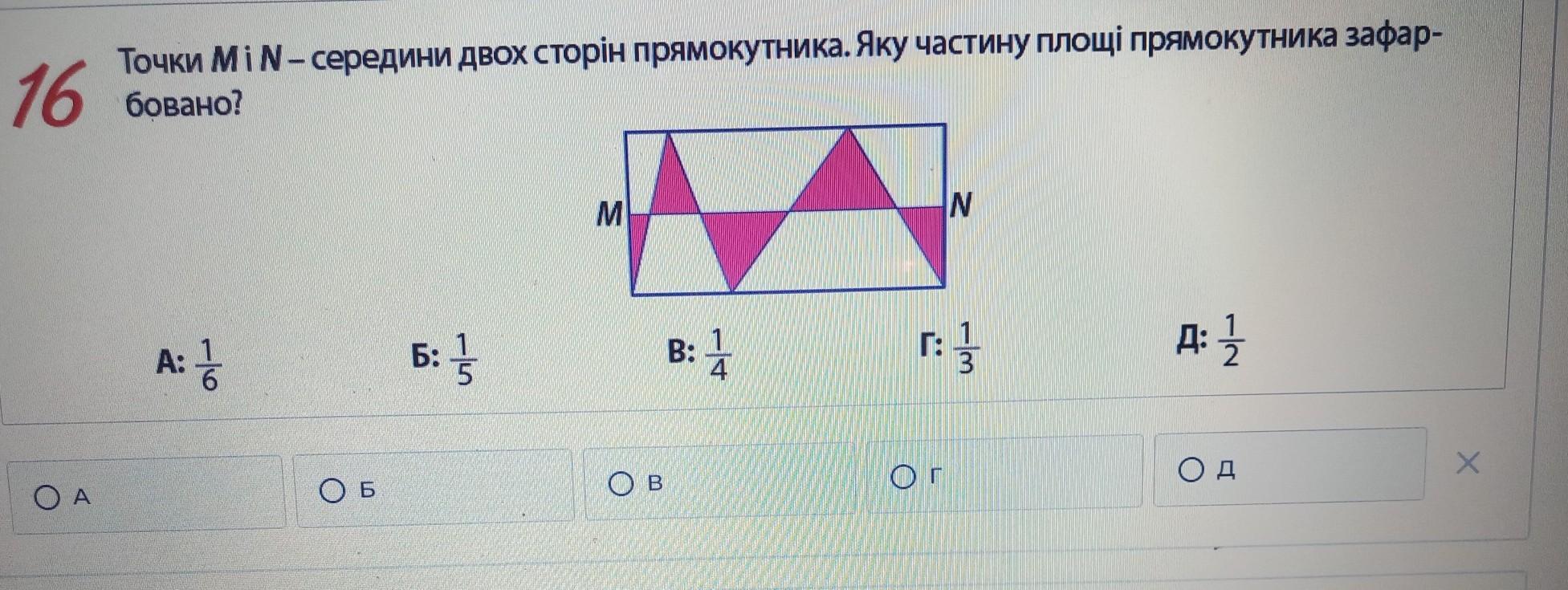 Точки Mi N-середини двох сторін прямокутника. Яку частину площі прямокутника зафар- бовано?