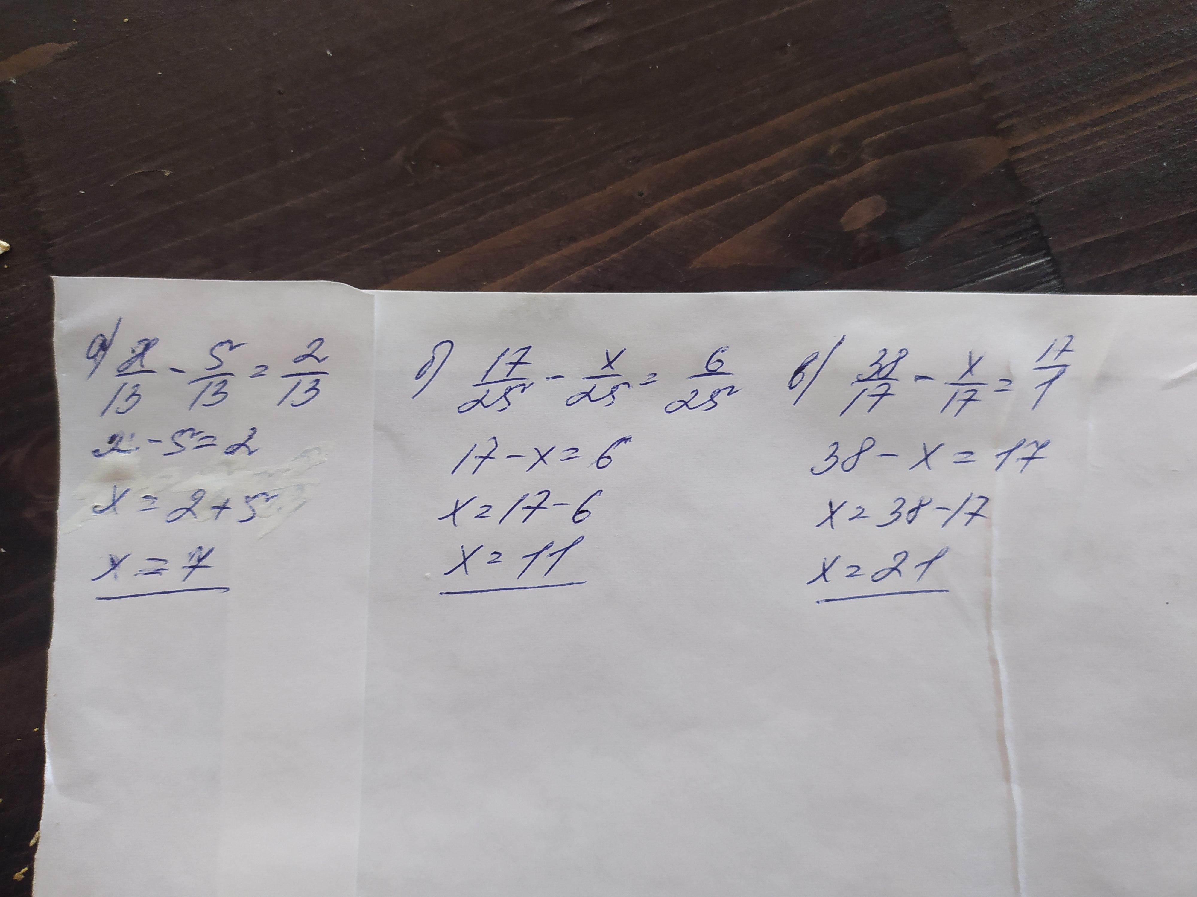1083. Яким числом треба замінити x, щоб рiвнiсть була правильною:a) x/13-5/13=2/13, б) 17/25-x/25=6/25, в)) 38/17-x/17=1?