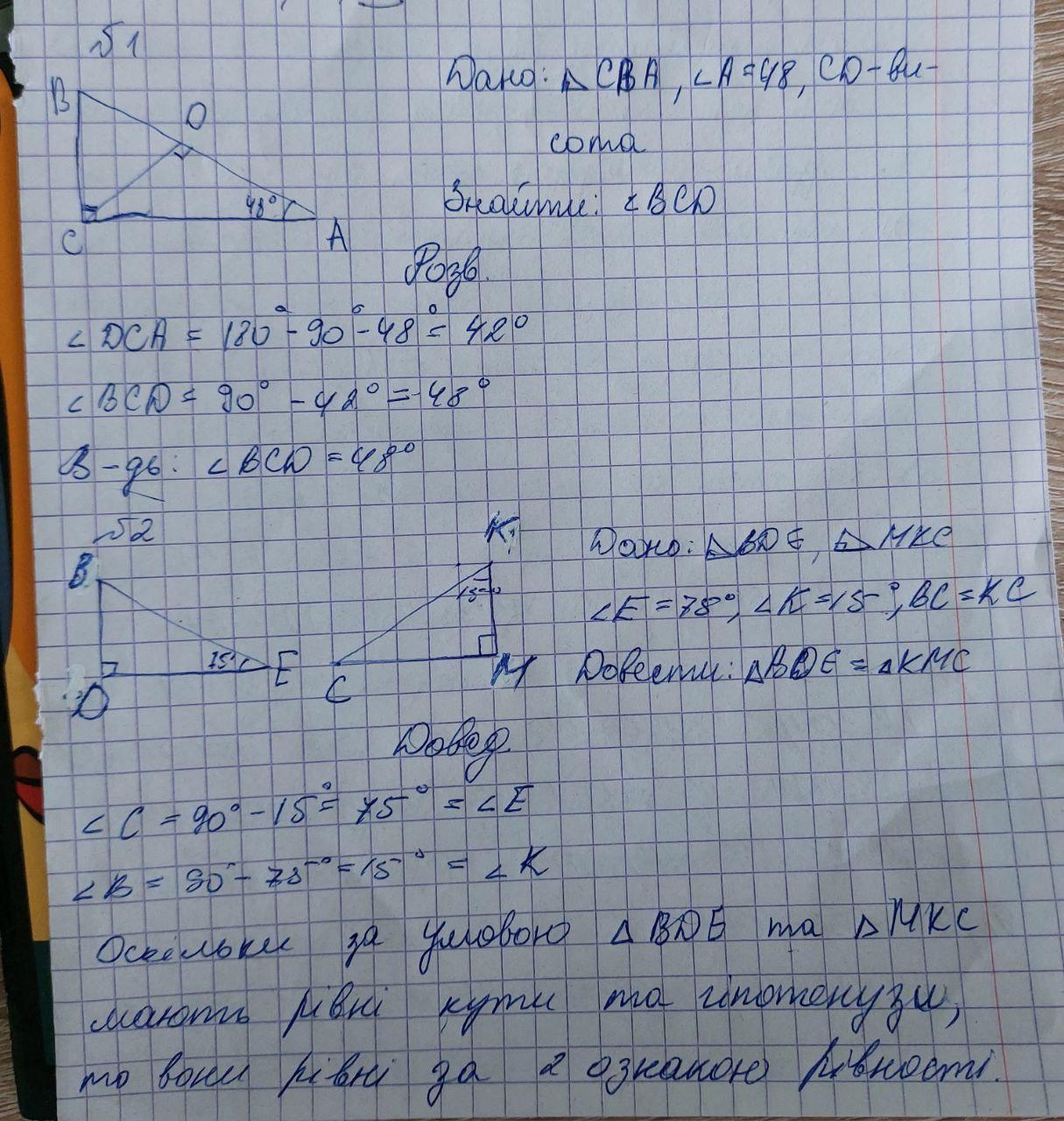 №1.У прямокутному трикутнику АВС із прямим кутом С та ∠А = 48° проведено висоту CD. Знайди ∠BCD.