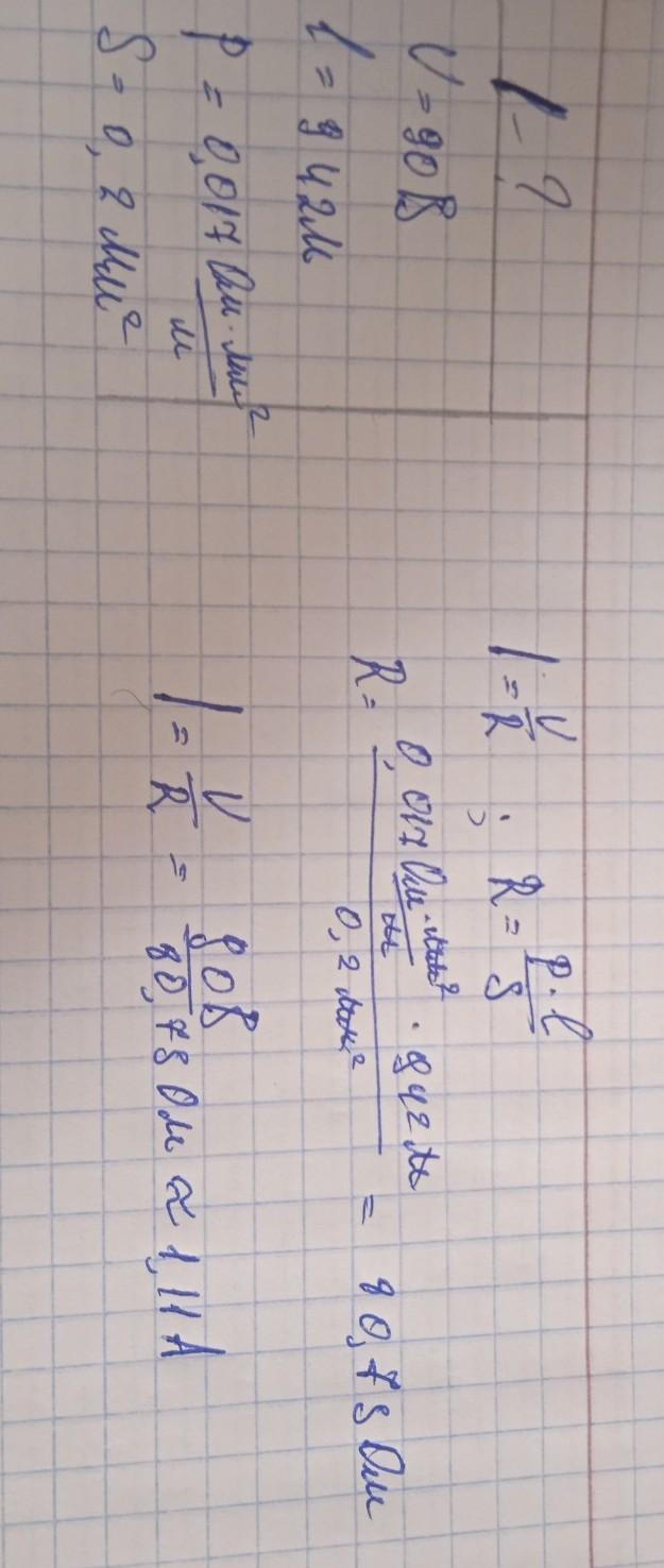 Чому дорівнює сила струму, що проходить через реостат, виготовлений із мідного провідника довжиною 942м і площею поперечного перерізу 0,2мм², якщо напруга на затискачах реостата - 90В