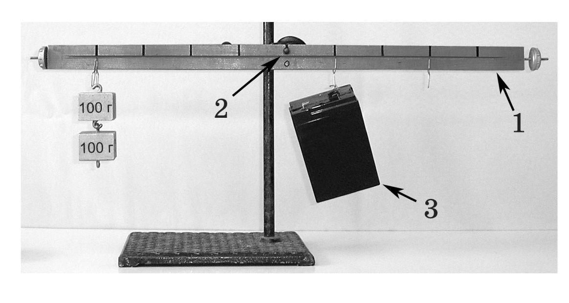 Важіль 1 без тертя може вільно обертатися навколо осі 2, як зображено на рисунку. Спочатку без важків та вантажу 3 важіль було зрівноважено. Визначте масу вантажу 3.