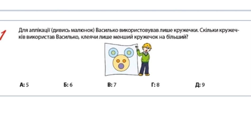 Питання "Скільки кружечків використав хлопчик?", відповідь 8! А те, що він клеїв менший кружечок на більший, написано для того, щоб ми розуміли, що під більшим кружечком немає меншого, якого б не було видно.