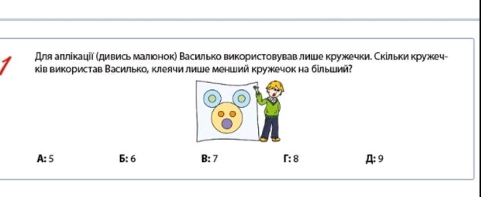 1 Для аплікації (дивись малюнок) Василько використовував лише кружечки. Скільки кружеч- ків використав Василько, клеячи лише менший кружечок на бiльший? A: 5 Б: 6 B: 7 r: 8 Д: 9