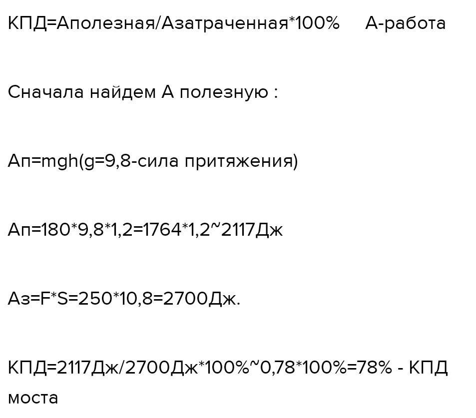 По наклонному помосту длиной 10,8 м и высотой 1,2 м поднимают груз массой 180 кг,прилагая силу в 250 Н.определите КПД помоста