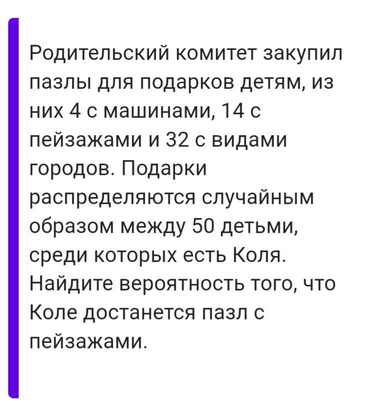 Ответ: вероятность того, что Коле достанется пазл с пейзажами, равна 0,28 или 28%.
