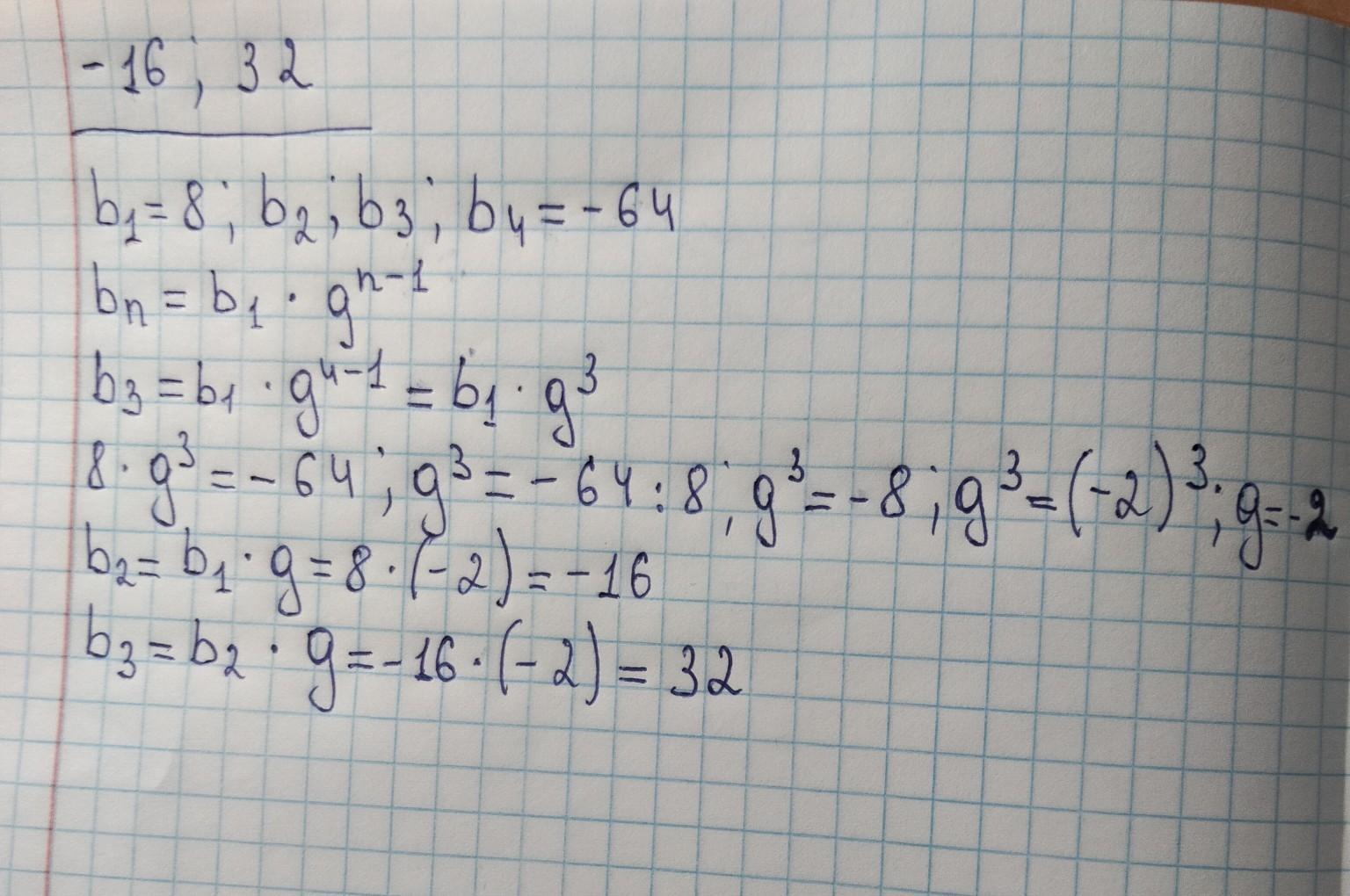 Між числами 8 i -64 вставте два таких числа, щоб вони разом із поданими утворювали геометричну прогресію.