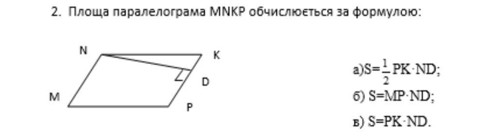 Площа паралелограма дорівнює добутку висоти і сторони, до якої проведена висота.