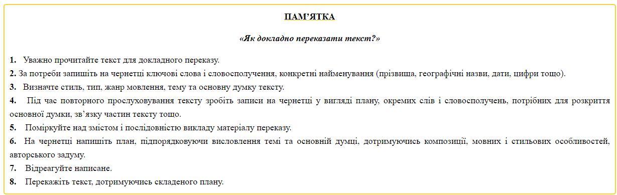 докладним усним переказом розповідного тексту художнього стилю з елементами опису зовнішності людини (за складним планом). Зверни увагу на вказівки щодо переказу тексту.