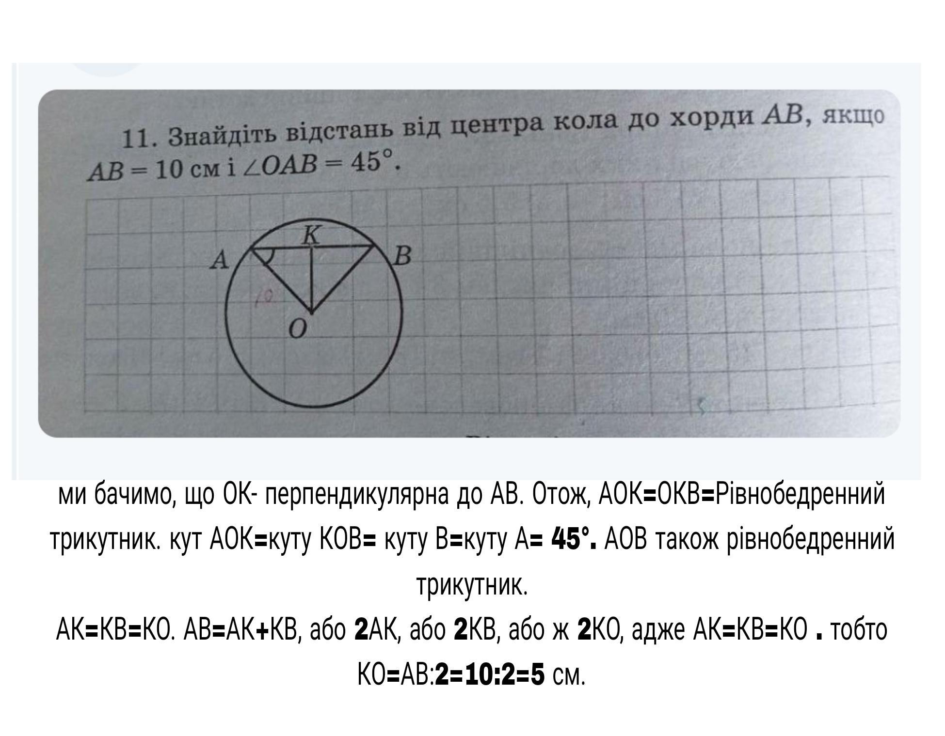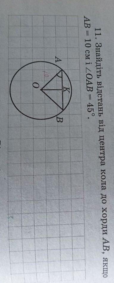 Знайдіть відстань від центра кола до хорди AB=10 см i кут OAB=45°