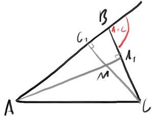 AA1, CC1 - высоты. В четырехугольнике BA1MC1 противоположные углы - прямые, сумма 180. Это признак вписанного четырехугольника.