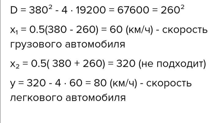 3 міста А в місто В, відстань між якими дорівнює 320 км, виїхав вантажний автомобіль. Через 3 години після цього з міста В у місто А виїхав легковий автомобіль, який зустрівся з вантажним через 1 годину після свого виїзду. Легковий автомобіль долає відстань між містами А і В на 1 год 20 хв швидше, ніж вантажний. Знайдіть швидкість кожного автомобіля.
