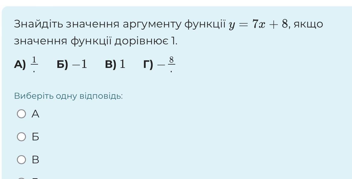 Б) - 1. Замість «у» підставляємо 1 і розв‘зуємо рівняння. 7х+8=1; 7х=1-8; 7х=-7; х= -7:7; х= -1