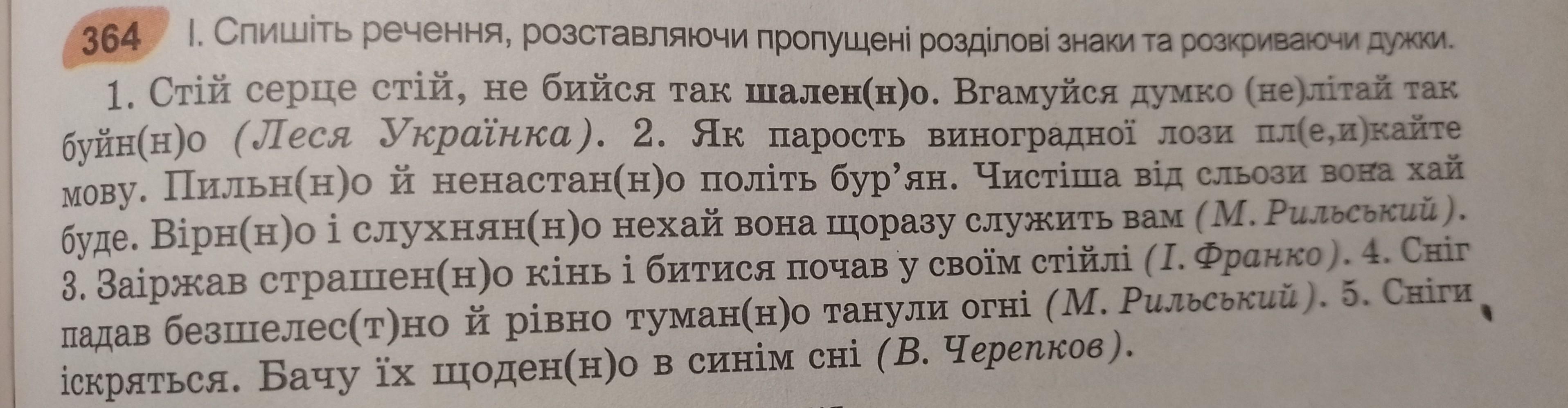 стій, серце, стій, не бийся так шаленно. Вгамуйся думко, не літай так буйно. 2. Як парость виноградної лози плекайте мову. Пильно й ненастанно політь бур'ян. Чистіша від сльози вона хай буде. Вірно і слухнянно нехай вона щоразу служить вам. 3. Заіржав страшенно кінь і битися почав у своїм стійлі. 4. Сніг падав безшелестно й рівно туманно танули огні. 5. Сніги іскряться. Бачу їх щоденно в синім сні.