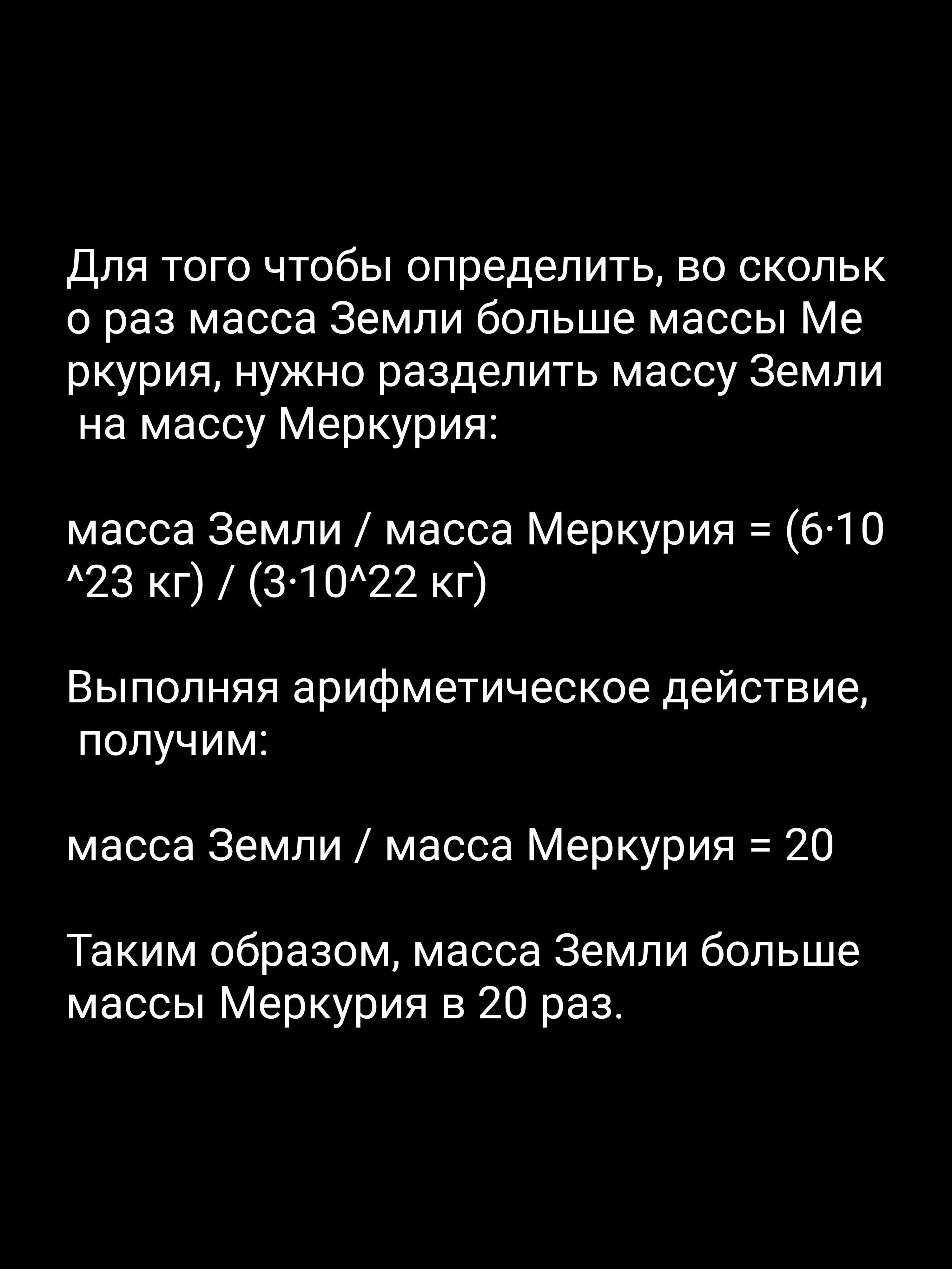 Меркурий — ближайшая к Солнцу планета Солнечной системы. Масса Земли составляет около 6⋅10^23 кг, а масса Меркурия — около 3⋅10^22 кг.