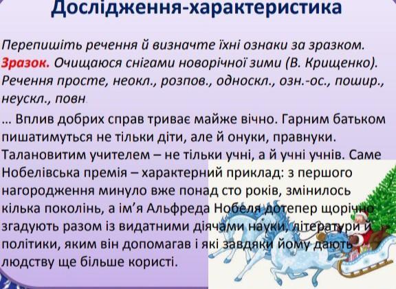 Дослідження-характеристика Перепишіть речення й визначте їхні ознаки за зразком. Зразок. Очищаюся снігами новорічноï зими (В. Крищенко). Речення просме, неокл., розпов., односкл., озн.-ос., пошир., неускл., повн ... Вплив добрих справ триває майже вічно. Гарним батьком пишатимуться не тільки діти, але й онуки, правнуки. Талановитим учителем - не тільки учні, а й учні учнів. Саме Нобелівська премія - характерний приклад: з першого нагородження минуло вже понад сто років, змінилось кілька поколінь, а ім'я Альфреда Нобеля дотепер щорічно згадують разом із видатними діячами науки, літератури й політики, яким він допомагав і які завдяки йому дають людству ще більше користі.Домоможіть будь ласка.Буду дуже вдячна вам