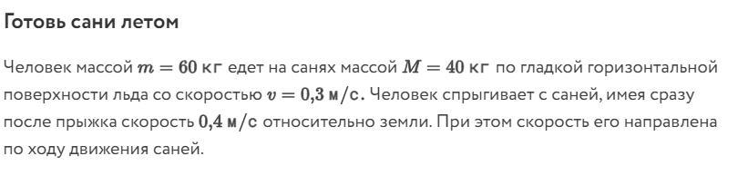 2) С какой скоростью должен прыгнуть человек, чтобы сани остановились? Ответ выразите в м/с округлив до десятых.