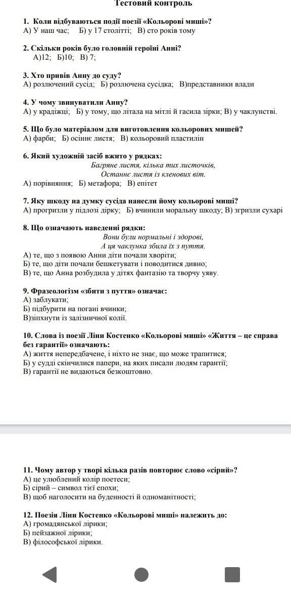 Ліна Костенко «Кольорові миші» Тестовий контроль 1. Коли відбуваються події поезії «Кольорові миші»? А) У наш час; Б) у 17 столітті; в) сто років тому 2. Скільки років було головнiй героїні Аннi? A)12; Б)10; В) 7; 3. Хто привів Анну до суду? А) розлючений сусід; Б) розлючена сусідка; В)представники влади 4. У чому звинуватили Анну? А) У крадіжцi; Б) у тому, що літала на мітлі й гасила зірки; В) у чаклунстві. 5. Що було матеріалом для виготовлення кольорових мишей, А) фарби; Б) осіннє листя; в) кольоровий пластилін 6. Який художній засіб вжито у рядках: Багряне листя, кілька тих листочків, Останнє листя із кленових віт. А) порівняння; Б) метафора; в) епітет 7. Яку шкоду на думку сусіда нанесли йому кольорові миші? А) прогризли у підлозi дiрку; Б) вчинили моральну шкоду; в) згризли сухарі 8. Що означають наведенні рядки: Вони були нормальнi i здорові. А ця чаклунка збила їх з пуття. А) те, що з появою Анни дİти почали хворіти; Б) те, що діти почали бешкетувати і поводитися дивно; В) те, що Анна розбудила у дітях фантазію та творчу уяву. 9. Фразеологізм «збити з пуття>> означас: А) заблукати; Б) підбурити на погані вчинки; В)зiпхнути iз залізничноï колії. 10. Слова iз поезії Ліни Костенко «Кольорові миші>> «Життя - це справа без гарантії>> означають: А) життя непередбачене, і ніхто не знає, що може трапитися; Б) у судді скінчилися папери, на яких писали людям гарантії; В) гарантії не видаються безкоштовно. 11. Чому автор у творі кілька разів повторює слово «cipий>>? А) це улюблений колір поетеси; Б) сірий - символ тієї епохи: В) щоб наголосити на буденності й одноманітності; 12. Поезія Ліни Костенко «Кольорові миші>> належить до: А) громадянської лiрики; Б) пейзажної лірики; В) філософської лірики.