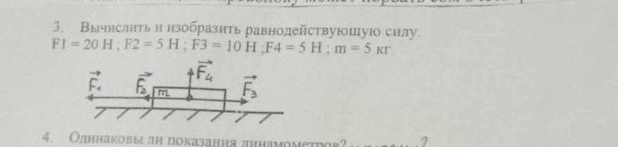 3. Вычислить и изобразить равнодействующую силу. F1 = 20 H. F2 = 5 H F3 = 10 H F4 = 5 H ; m = 5 кг. +F
