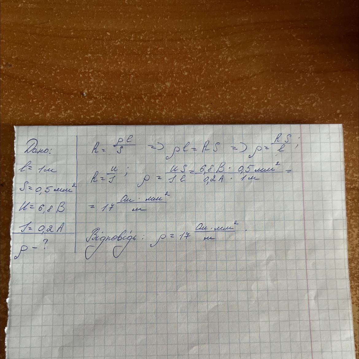 визначити питомий опір речовини провідника довжина якого 1 ом і площа поперечного перерізу 0,5 мм2, якщо при напрузі 6,8 в сила струму у ній 0,2 а.