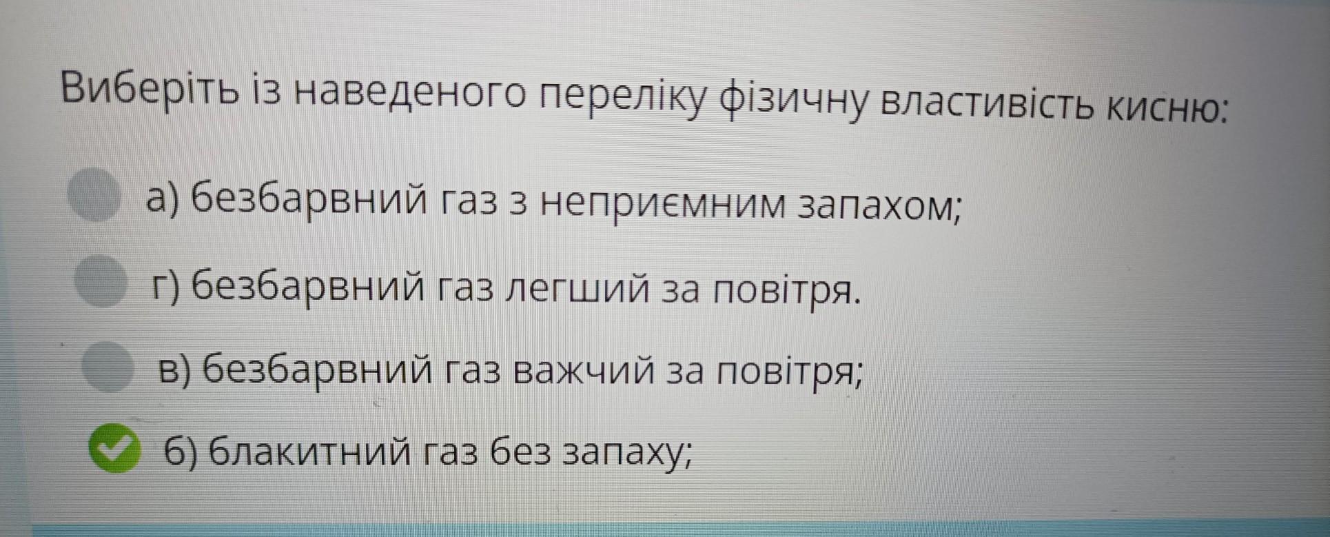 Безбарвний газ важчий за повітря (моляр. маса повітря - 28,96 моль, а кисню - 29)