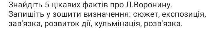 помогите срочно. Знайдіть 5 цікавих фактів про Л.Воронину. Запишіть у зошити визначення: сюжет, експозиція, зав'язка, розвиток дії, кульмінація, розв'язка.