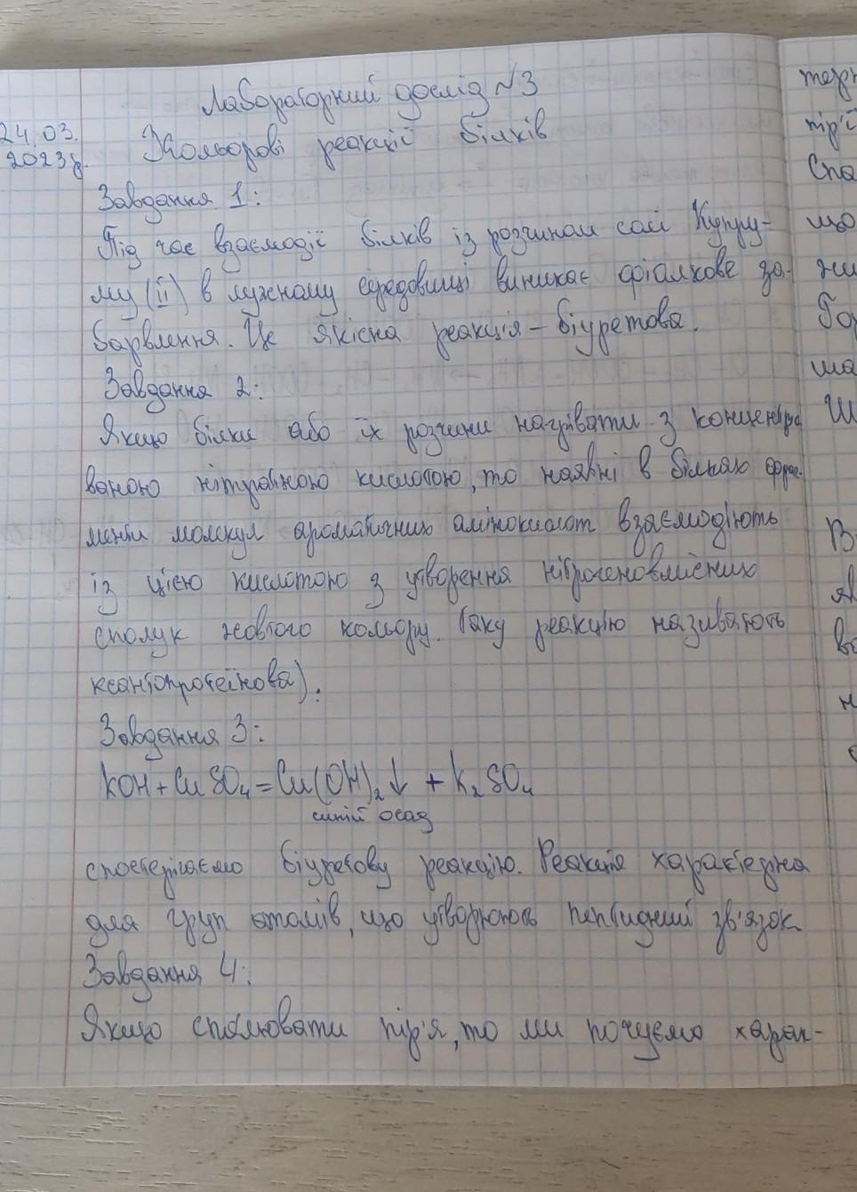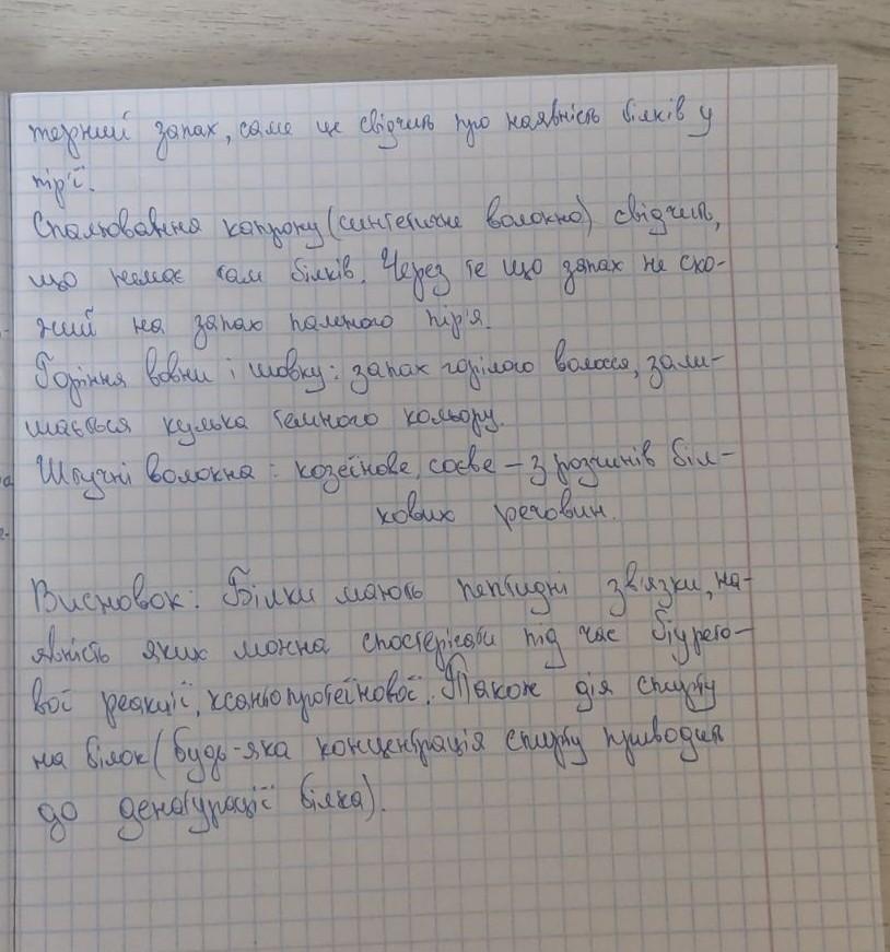 Лабораторний дослід 3 Кольорові реакції білків Для проведення досліду вам знадобляться: водний розчин білка курячо- го яйця, клаптики вовняної чи шовкової тканин, пір'їна, розчин лугу, розчин купрум(II) сульфату, концентрована нітратна кислота, м'ясний бульйон, про- бірки, тримач для пробірок, спиртівка чи сухе пальне, сірники, підставки з вогнетривкого матеріалу, металеві щипці. Не забувайте про правила безпечної роботи в хімічному кабінет и дотримуйтеся їх! Завдання . Проведіть якісне визначення білкових молекул у розчині біл ка курячого яйця за допомогою розчинів купрум(II) сульфату та лугу. Налийте в пробірку 1 мл розчину білка курячого яйця, додайте стільки ж розчину лугу та кілька крапель розчину купрум(II) сульфату. Спостерігайте за змінами у пробірці. Про що вони свідчать? Завдання 2. Проведіть якісне визначення білкових молекул у розчині за допомогою концентрованої нітратної кислоти. Налийте в пробірку 1 мл розчину білка курячого яйця, додайте кілька кра- пель концентрованої нітратної кислоти. Спостерігайте за утворенням білого осаду. Злегка нагрівайте його, доки у пробірці не з'явиться жовтий осад. Дайте пояснення появі жовтого осаду. Завдання 3. Перевірте наявність білків у м'ясному бульйоні за допомо- гою однієї з кольорових реакцій на білок за особисто розробленим планом дослідження. Завдання 4. Перевірте, яке з волокон (тканин) має білкове походження, а яке - ні. Знайте, що під час спалювання матеріалів білкового походження (нитки, тканини) відчувається запах паленого пір'я. Після згорання такого матеріалу залишається небагато розсипчастого попелу. Інші наслідки має спалювання синтетичних волокон - запах зовсім не схожий на запах паленого пір'я, після горіння залишається чорна тверда кулька. Передусім спаліть пір'їну в полум'ї сірника та відчуйте характерний запах, після цього проведіть спалювання виданих клаптиків тканин чи ниток волокон різного походження та знайдіть серед них ті, що мають білковий склад. Спа- лювання здійснюйте на підставці з вогнетривкого матеріалу або тримаючи пір'їну чи клаптик тканини у тримачі для пробірок або металевих щипцях. Сформулюйте загальний висновок про те, як можна довести наявність білкових молекул у розчині чи у складі матеріалів.