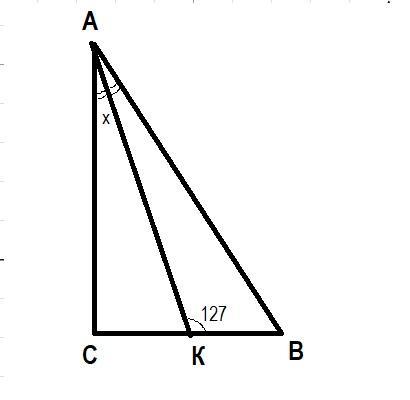 Дано трикутник АBC |_С=90 |_AKB=127,AK-бісекртиса чому дорівнює В?