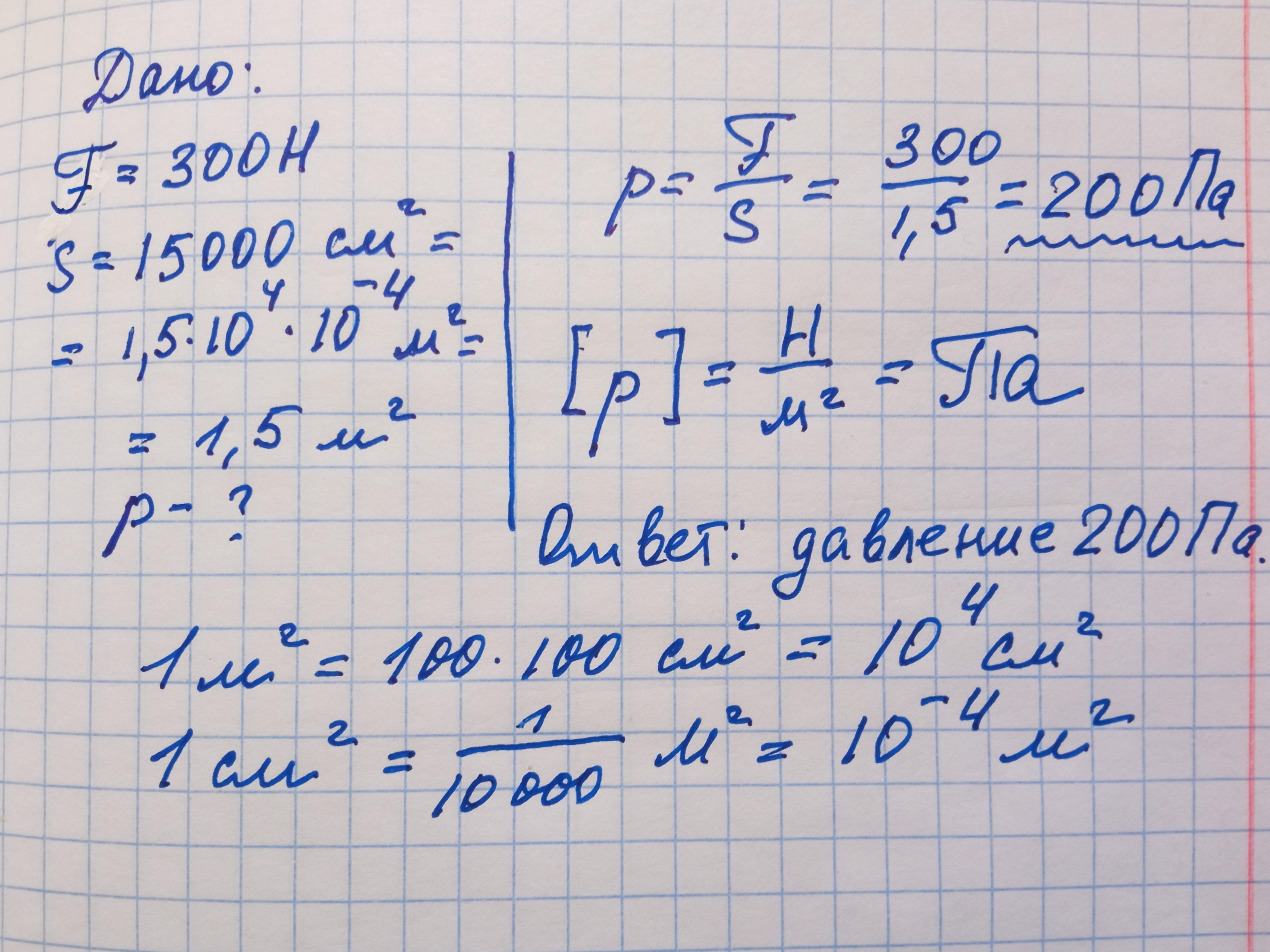 Таким образом, сила 300 Н, действующая на поверхность площадью 15000 см², создает давление в 200 Па.