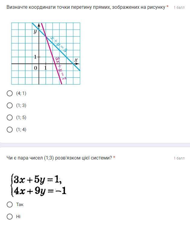 1)Визначте координати точки перетину прямих, зображених на рисунку: