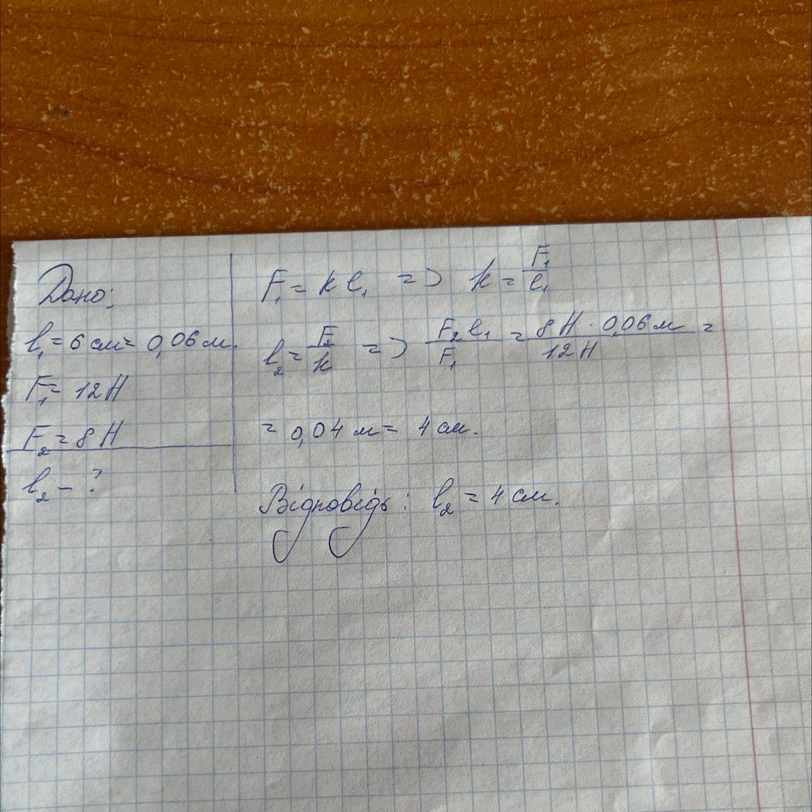 Щоб стиснути пружину на 6 см, треба прикласти силу 12 Н. На скільки розтягнеться пружина, якщо на неї діяти з силою 8 Н? дано/розв'язання