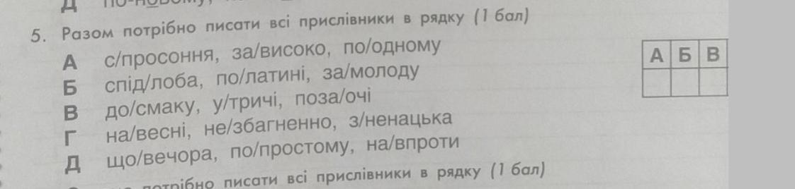 5. Разом потрібно писати всі прислівники в рядку (1 бал)