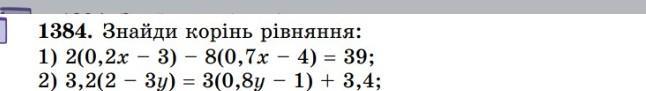 3 1384. Знайди корiнь рiвняння: 1) 2(0,2x - 3) - 8(0,7x - 4) = 39; 2) 3,2(23y) = 3(0,8y − 1) + 3,4;