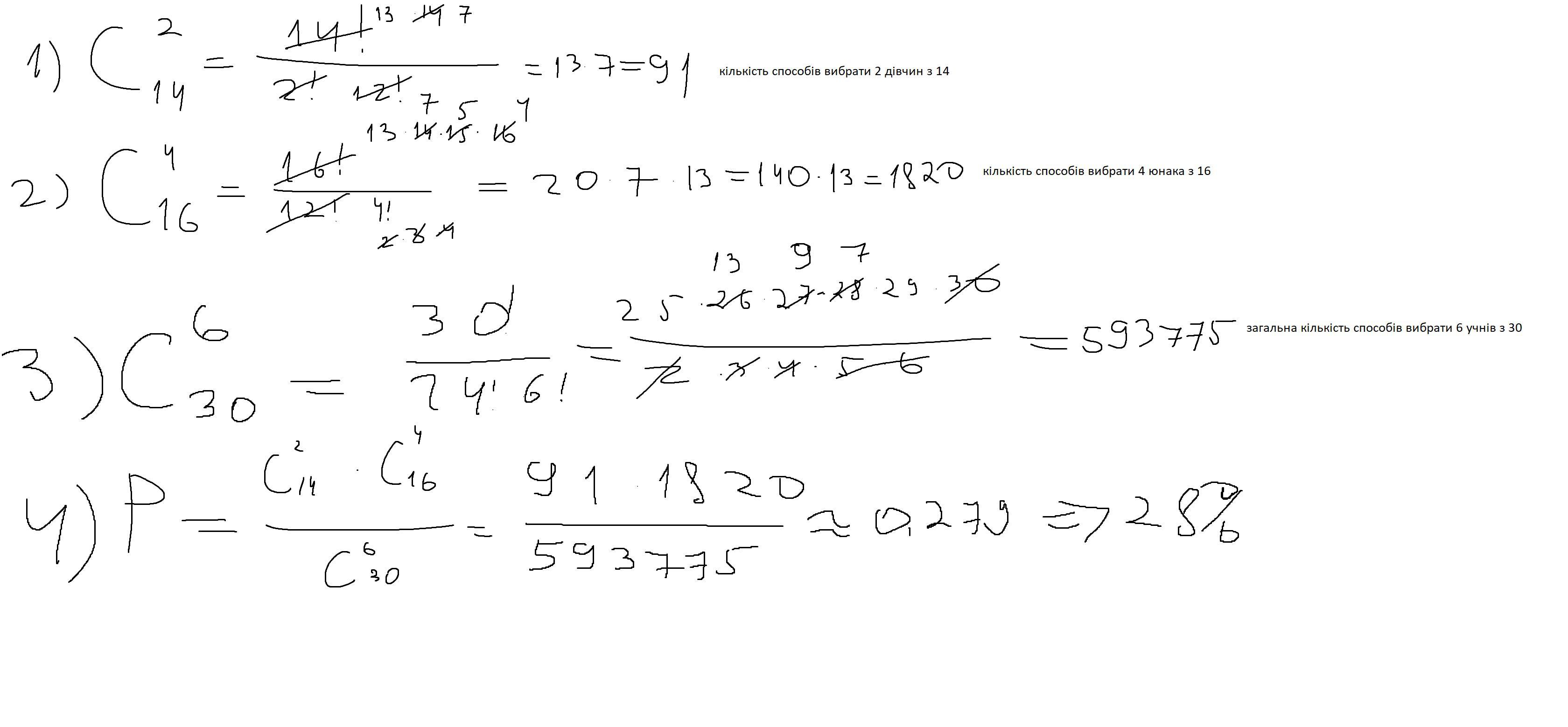 У класі 16 юнаків і 14 дівчат. Для прибирання актової зали до святкового вечора необхідно відправити 6 учнів. Учнів вибирають навмання за номером у журнальному списку. Чому дорівнює ймовірність того, що залу будуть прибирати дві дівчини і чотири юнаки?