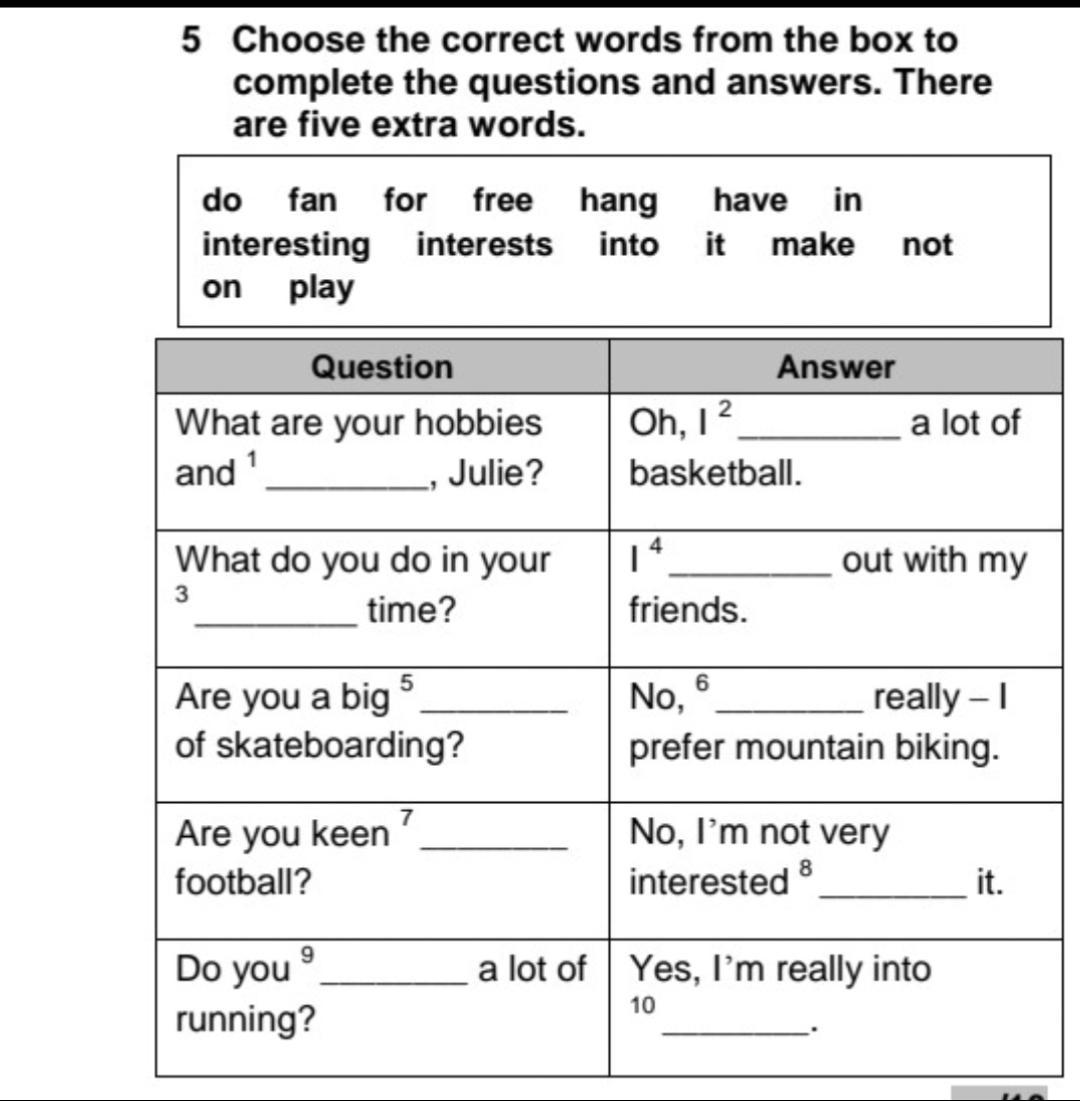 Choose the correct words from the box to complete the questions and answers. There are five extra words.