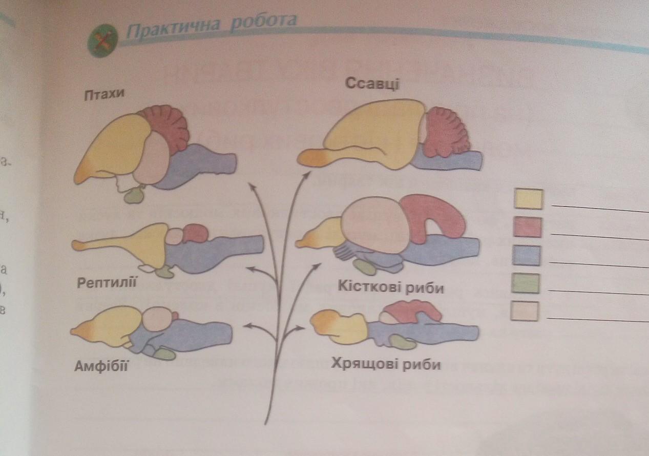 Ответ: Розовый цвет это мозочок, желтым цветом: Півкулі переднього мозку, синим цветом: проміжний мозок, зеленим кольором: довгастий мозок, тілесним кольором зображено середній мозок.
