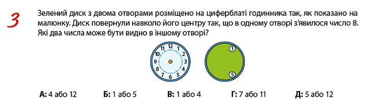 Зазвичай на циферблаті годинника є 12 чисел, від 1 до 12. Кут, на який повертається диск, дорівнює куту між кожним числом на циферблаті, тобто 360 градусів, поділені на 12 рівних частин дорівнює 30 градусам.Якщо диск повернули настільки, що в одному отворі з'явилося число 8, то можна зрозуміти, що він повернувся на 240 градусів (8 чисел по 30 градусів кожне). Це означає, що інше число буде знаходитися на відстані 120 градусів (240 градусів поділено на 2) від числа 8.Таким чином, якщо в одному отворі з'явилось число 8, то інші два можливі числа, які можна побачити в іншому отворі, будуть розташовані на відстані 120 градусів від числа 8 в обох напрямках по годиннику і проти годинникової стрілки. Ці числа будуть 4 та 12 (8 + 120 градусів та 8 - 120 градусів відповідно).Отже, можливі варіанти чисел в іншому отворі циферблата: 4 та 12.