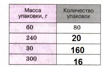 3. Певну кількість чаю потрібно розсипати в однакові упаковки. Установи залеж- нiсть між масою упаковки й кiлькiстю упаковок та заповни таблицю. Кількість упаковок, шт. 80 Маса упаковки, г 60 240 30 300.