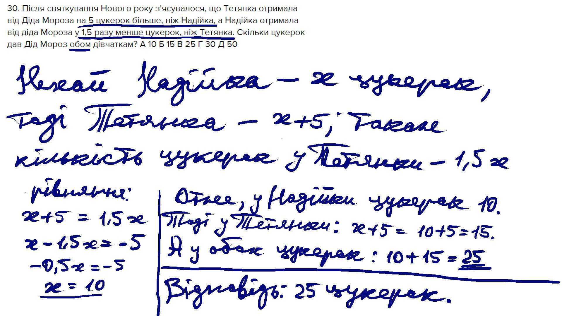 30. Після святкування Нового року з'ясувалося, що Тетянка отримала від Діда Мороза на 5 цукерок більше, ніж Надійка, а Надійка отримала від діда Мороза у 1,5 разу менше цукерок, нiж Тетянка. Скільки цукерок дав Дiд Мороз обом дiвчаткам? A 10 Б 15 B 25 Г 30 Д 50