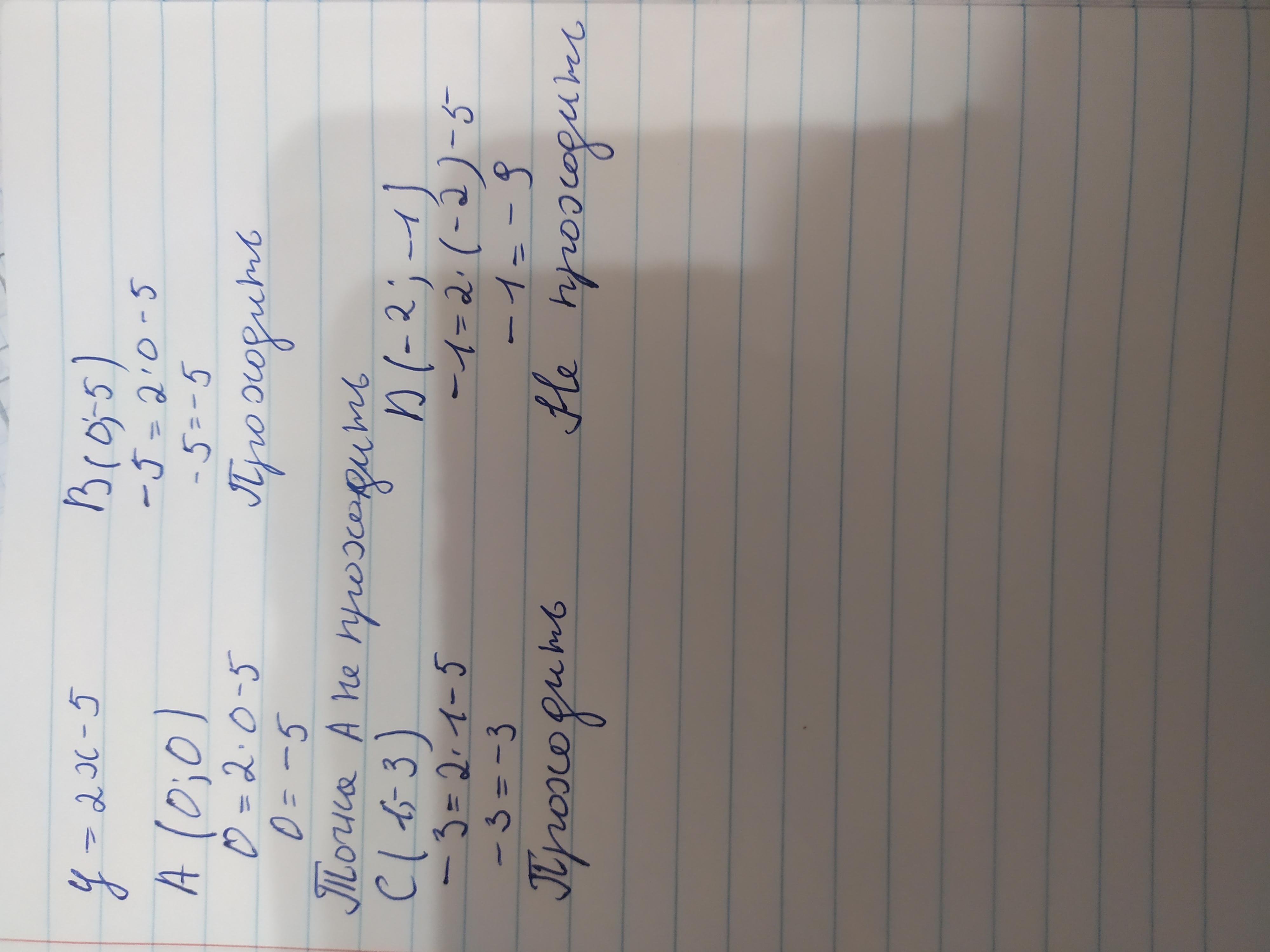 не виконуючи побудови графіка функції y= 2x - 5 визначте чи проходить графік через точки A (0;0), B (0; -5) C (1;-3) D (-2;-1)