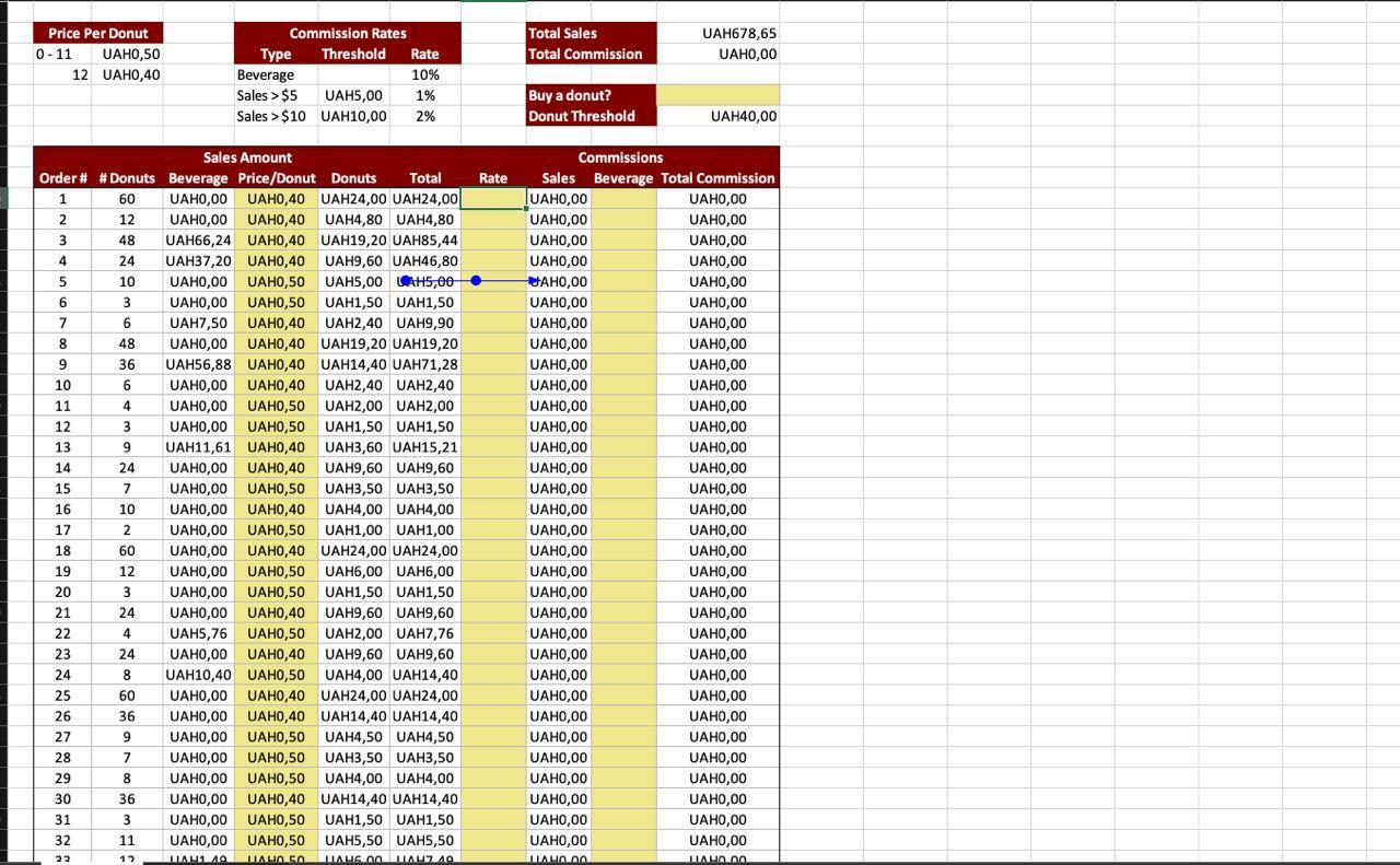 This formula checks if the total sale (cell F10) is greater than the threshold level in cell F5. If it is, then it returns the commission rate from cell G5 (2%). If it's not greater than the threshold level in cell F5 but is greater than the threshold level in cell F6 (more than $5), then it returns the commission rate from cell G6 (1%). Otherwise, if it's less than or equal to $5, then no commission is paid and 0 is returned.