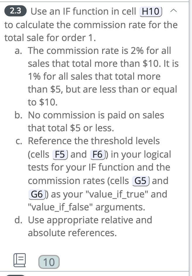 To calculate the commission rate for the total sale for order 1 using an IF function in cell H10, you can use the following formula: