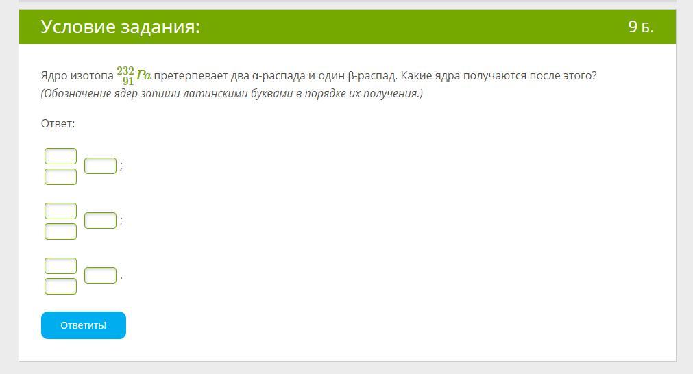 Ядро изотопа 232/91 претерпевает два альфа распада и один бета распад. Какие ядра получаются после этого?