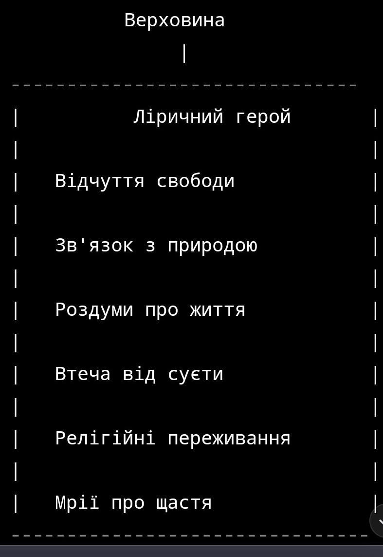 Для ліричного героя верховина символізує відчуття свободи та зв'язок з природою. На верховині герой може роздумувати про життя, втікати від суєти, переживати релігійні почуття та мріяти про щастя. Верховина є місцем, де ліричний герой може відчути гармонію з навколишнім світом та відновити свої сили.