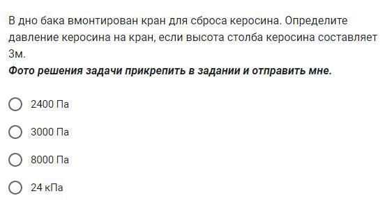 Давление жидкости на дно сосуда зависит от плотности жидкости, ускорения свободного падения и высоты столба жидкости. Формула для расчета давления имеет вид: P = ρ×g×h, где ρ - плотность жидкости в кг/м³, g - ускорение свободного падения в м/с² (принимаем равным 9.8 м/с²), h - высота столба жидкости в метрах. Подставляя данные из вашего задания, получаем: P = 800 кг/м³ × 9.8 м/с² × 3 м = 23520 Па = 23.52 кПа. Ответ: 23.52 кПа.